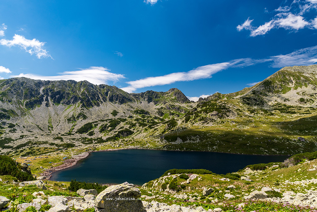 Jezero Bucura s okolními vrcholy v pohoří Retezat v Rumunsku (Bucura lake with hills around in Retezat mountains in Romania)
