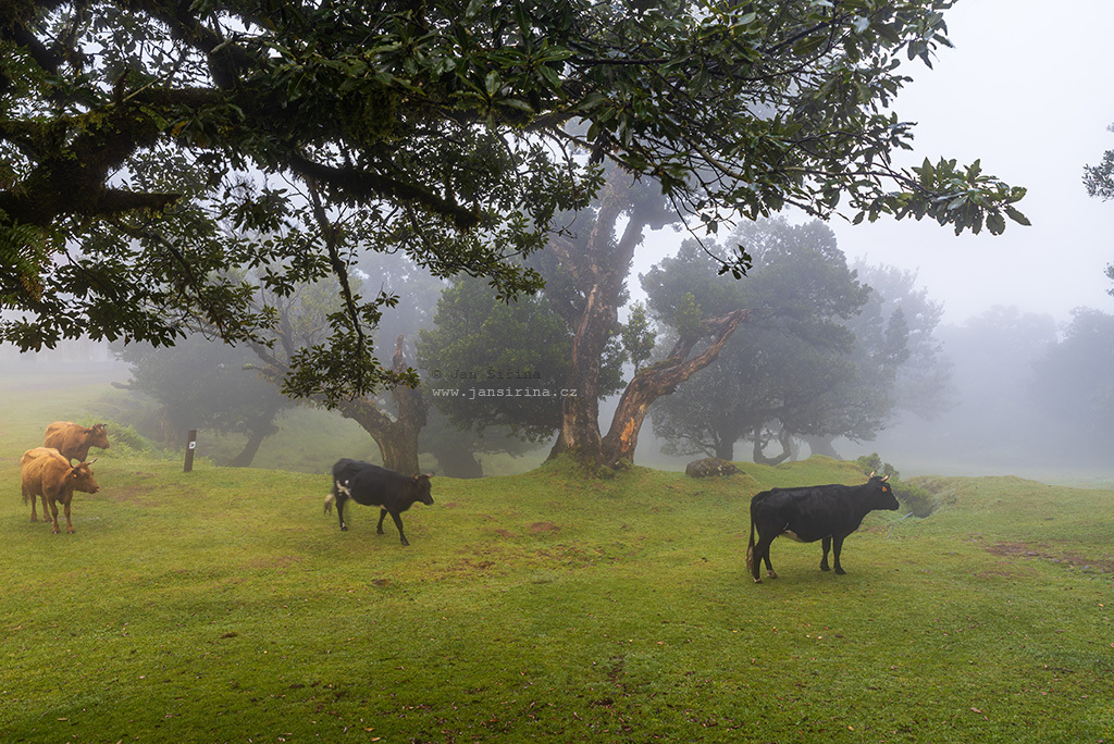 Mlžné ráno s volně se pasoucími krávami na Fanalu na Madeiře (Misty morning with feeding cows on Fanal in Madeira)