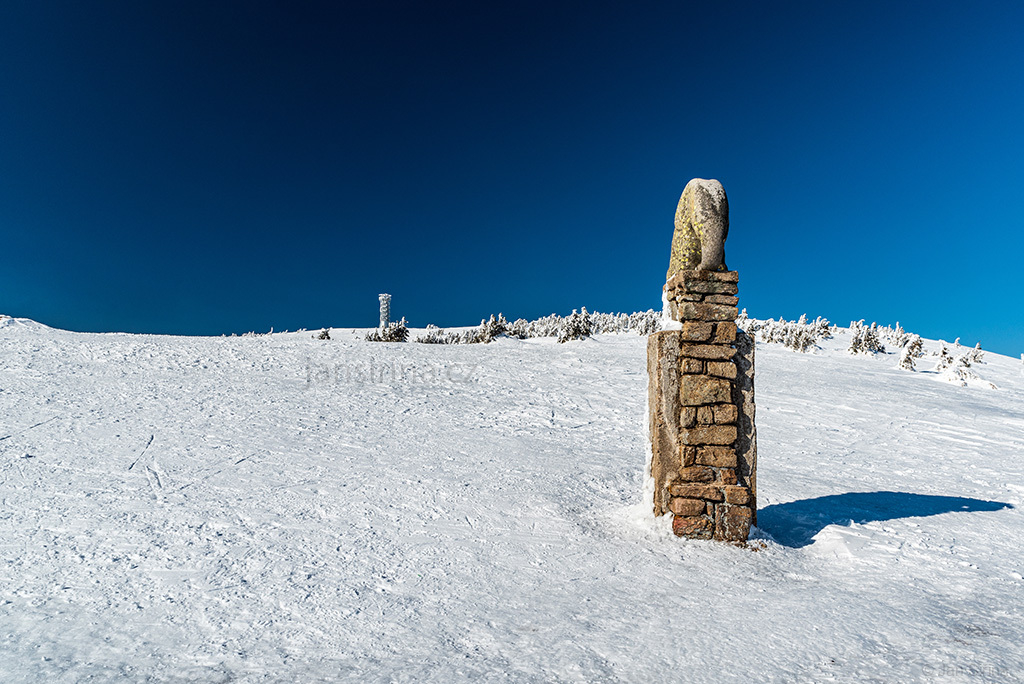Vrchol Králického Sněžníku se sochou slůněte pod vrcholem (Kralicky Sneznik hill with statue of little elephant bellow summit).