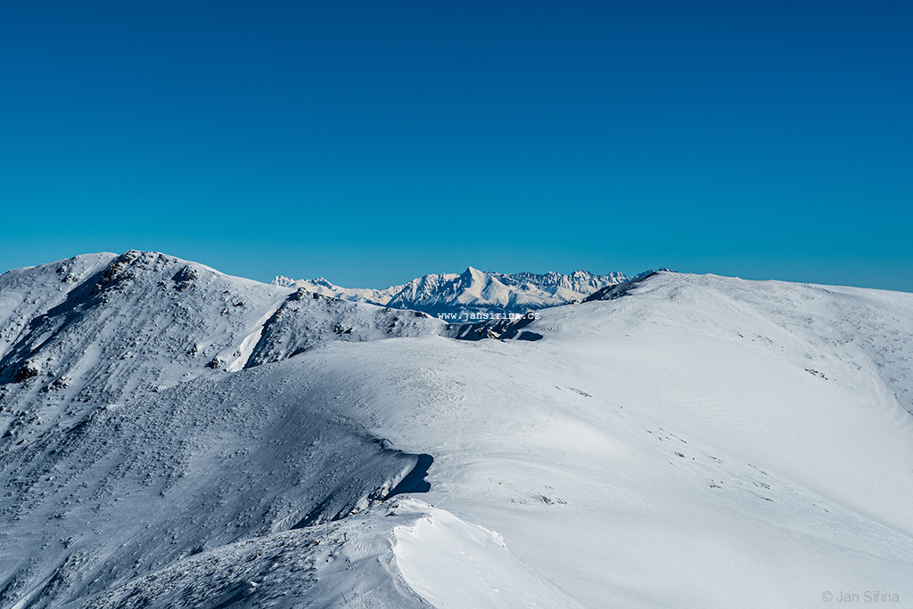 Výhled nad Krížskym sedlem na hlavním hřebeni Nízkých Tater mezi vrcholy Kotliská a Poľana během krásného zimního dne (View above Krizske sedlo mountain pass on main ridge of Low Tatras mountains between Kotliska and Polana hills in Slovakia during beautiful winter day)