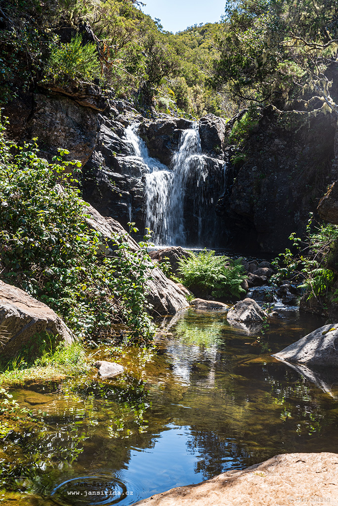Jezírko Lagoa do Lajeado s vodopádem na Madeiře (Lagoa do Lajeado lake with waterfall in Madeira)