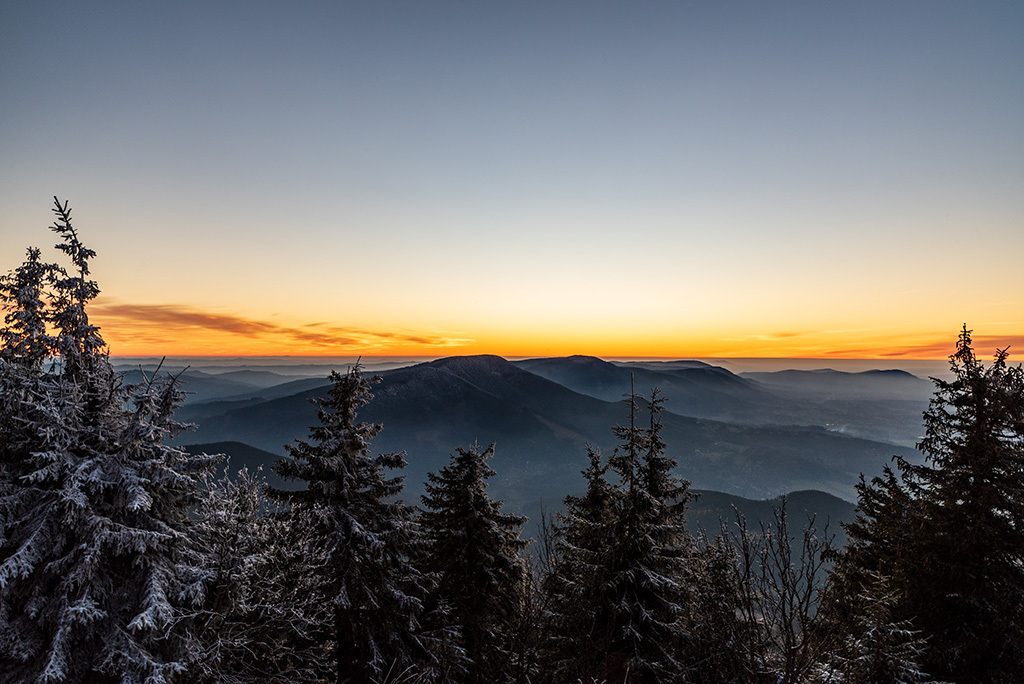 Výhled na Smrk, Kněhyni, Radhošť a další vrcholy z vrcholu Lysé hory v Moravskoslezských Beskydech těsně po pozdně podzimním západu slunce (View to Smrk, Knehyne, Radhost and other hills from Lysa hora hill summit in Moravskoslezske Beskydy mountains few minutes after late autumn sunset)
