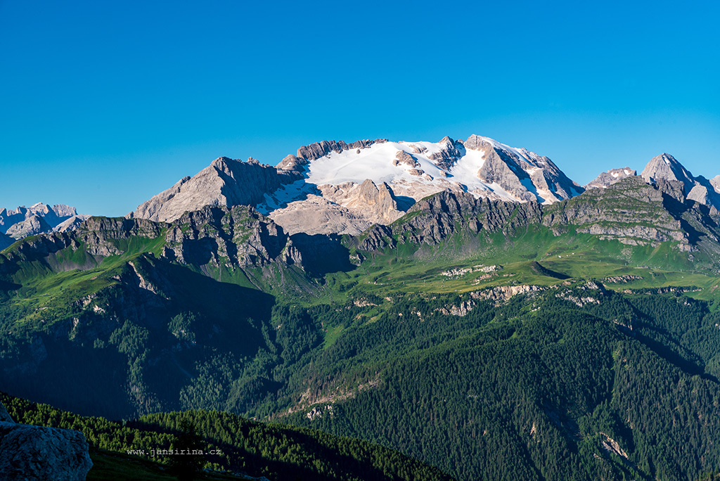 Ranní pohled na Marmoladu zpod vrcholu Setsas v Dolomitech (Morning view to Marmolada from bellow Setsas mountain peak in the Dolomites)