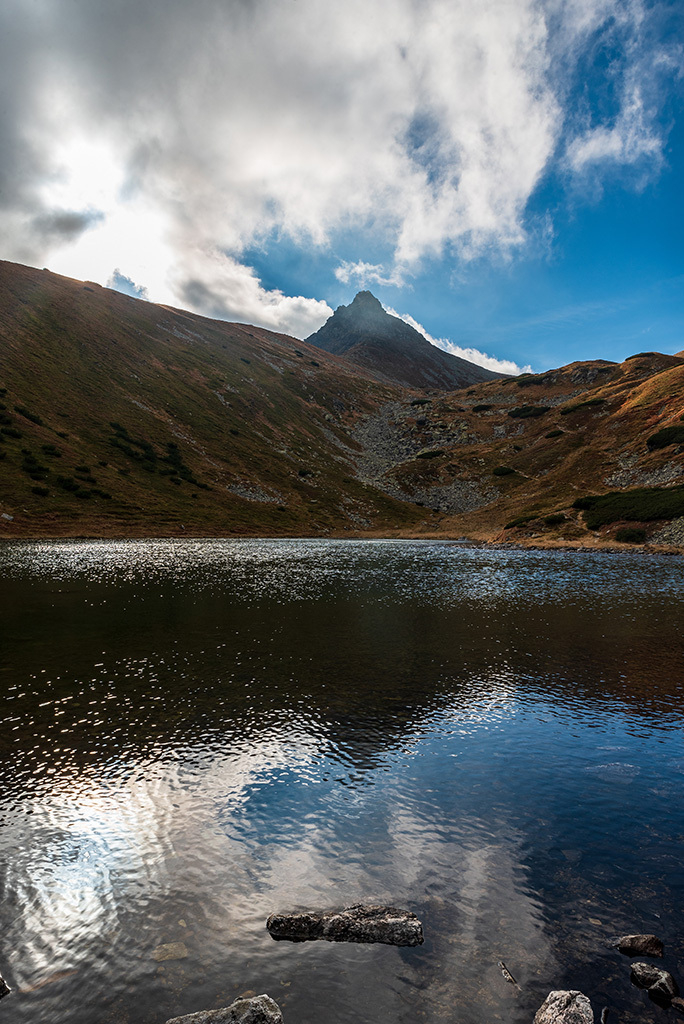 Nižné Jamnícke pleso v Jamnícke dolině s Ostrým Roháčem v podzimních Roháčích na Slovensku (Nizne Jamnicke pleso lake in Jamnicka dolina valley with Ostry Rohac mountain peak in autumn Rohace mountains in Slovakia