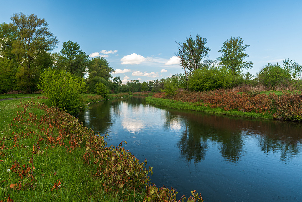 Řeka Olše tvořící česko-polskou hranici nedaleko Věřňovic na Karvinsku během hezkého jarního dne (Olse river near Vernovice village near Karvina city on czech – polish borders during beautiful springtime day)