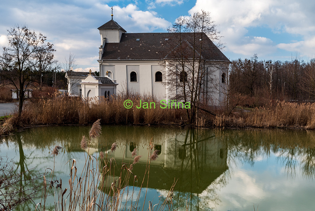 Kostel sv. Petra z Alkantary zrcadlící se na hladině vodní plochy v Karviné (Kostel sv. Petra z Alkantary church mirroring on waterground in Karvina city in Czech republic)