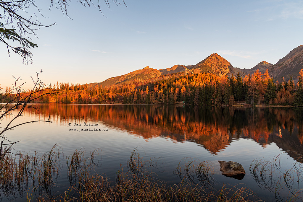 Štrbské pleso se štíty v pozadí ve Vysokých Tatrách během podzimního rána (Strbske pleso lake with peaks on the background in High Tatras mountains in Slovakia during autumn morning)