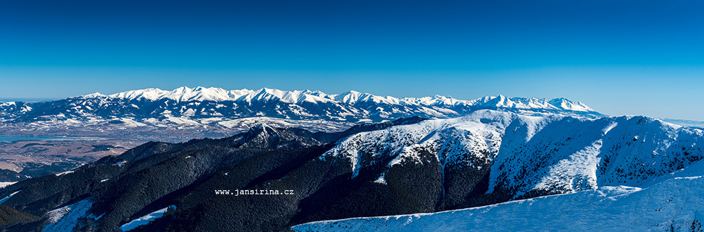 Výhled na Tatry z vrcholu Chabence v Nízkých Tatrách během krásného zimního dne (View to Tatra mountains from Chabenec hill summit in Low Tatras mountains in Slovakia during amazing winter day)