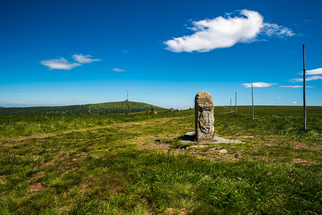 Výhled na Praděd z vrcholu Vysoké hole se starým hraničním mezníkem v letních Jeseníkách (View to Praded from Vysoka hole hill summit with old border stone in summer Jeseniky mountains in Czech republic)