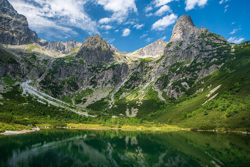 Nádherné Zelené pleso obklopené vysokými štíty v Dolině Zeleného plesa ve Vysokých Tatrách během letního rána (Amazing Zelene pleso lake with high peaks around in Dolina Zeleneho plesa valley in High Tatras mountains in Slovakia)