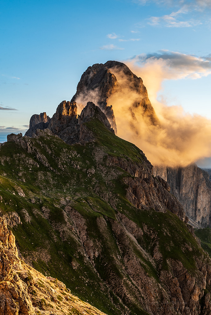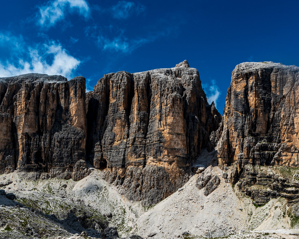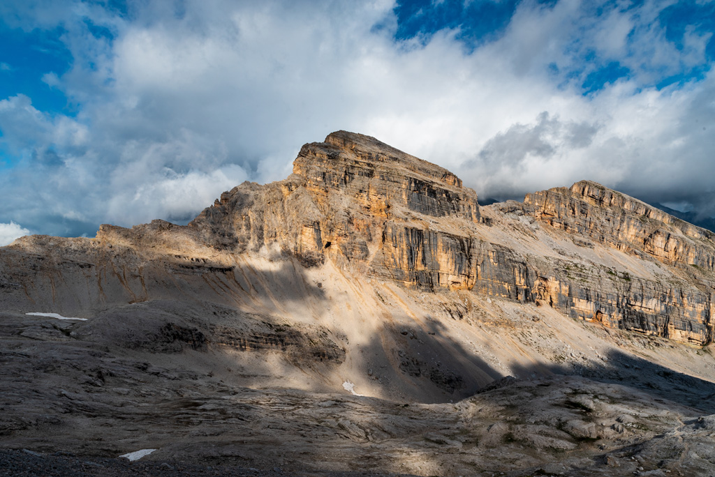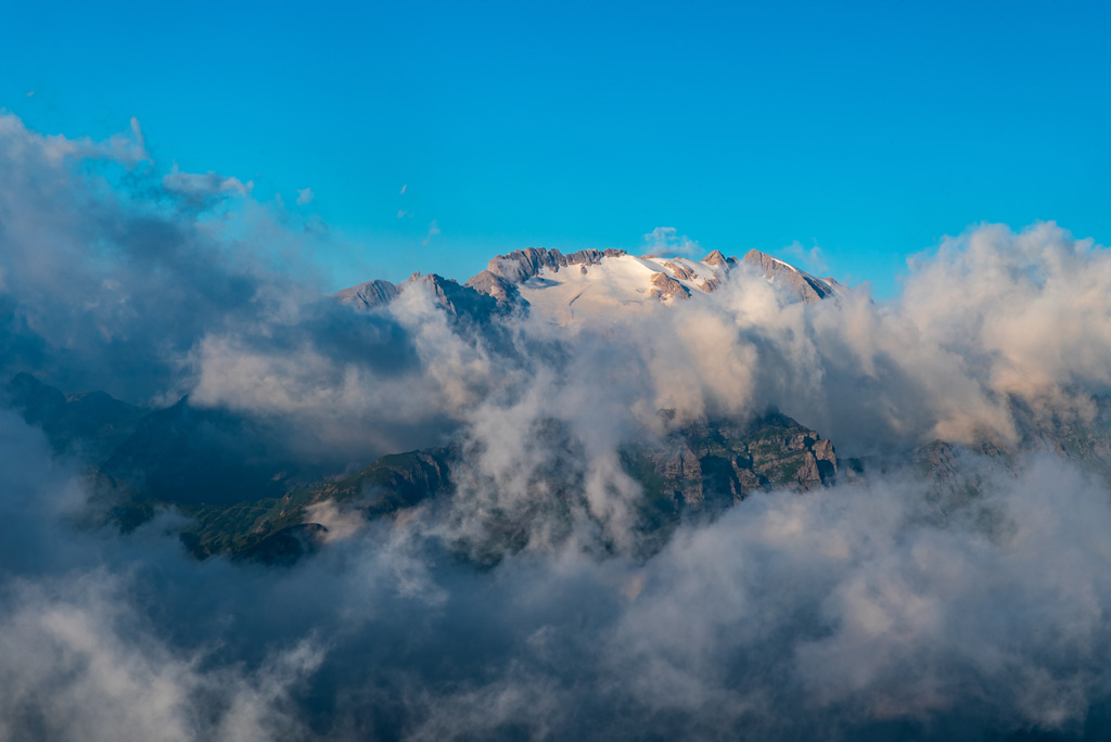 Na dnes jsem si po předchozích náročnějších dnech naordional jen kilometrově kratší túru přes vrchol Sief na vrchol Col di Lana. Ráno tedy nikam nespěchám, jako na dlani mám Marmoladu, k tomu modré nebe a hned od rána i teplo.