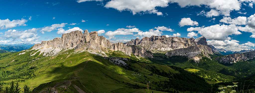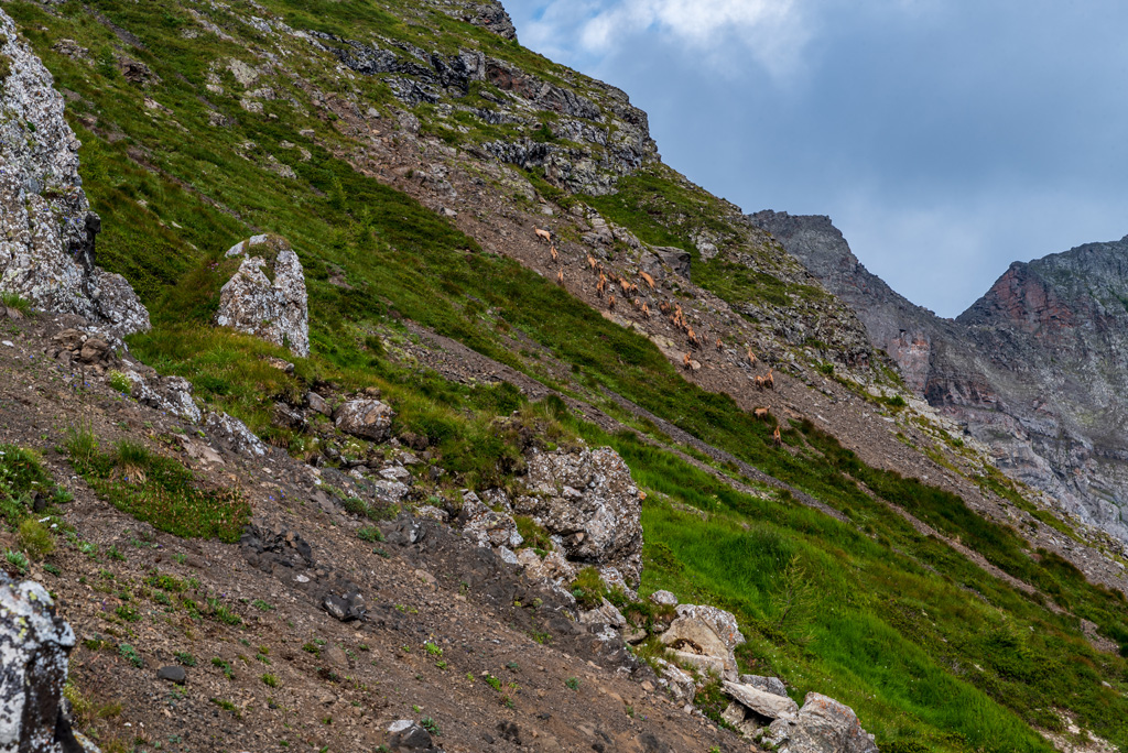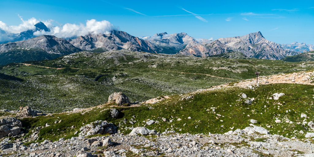 První úsek mého dnešního putování spočívá v sestupu až do lokality Castello pod sedlem Passo Falzarego. Zejména v úvodním úseku tohoto sestupu narážím i na stopy po 1. světové válce a společnost mi dělají krásné výhledy i velké stádo kamzíků.
