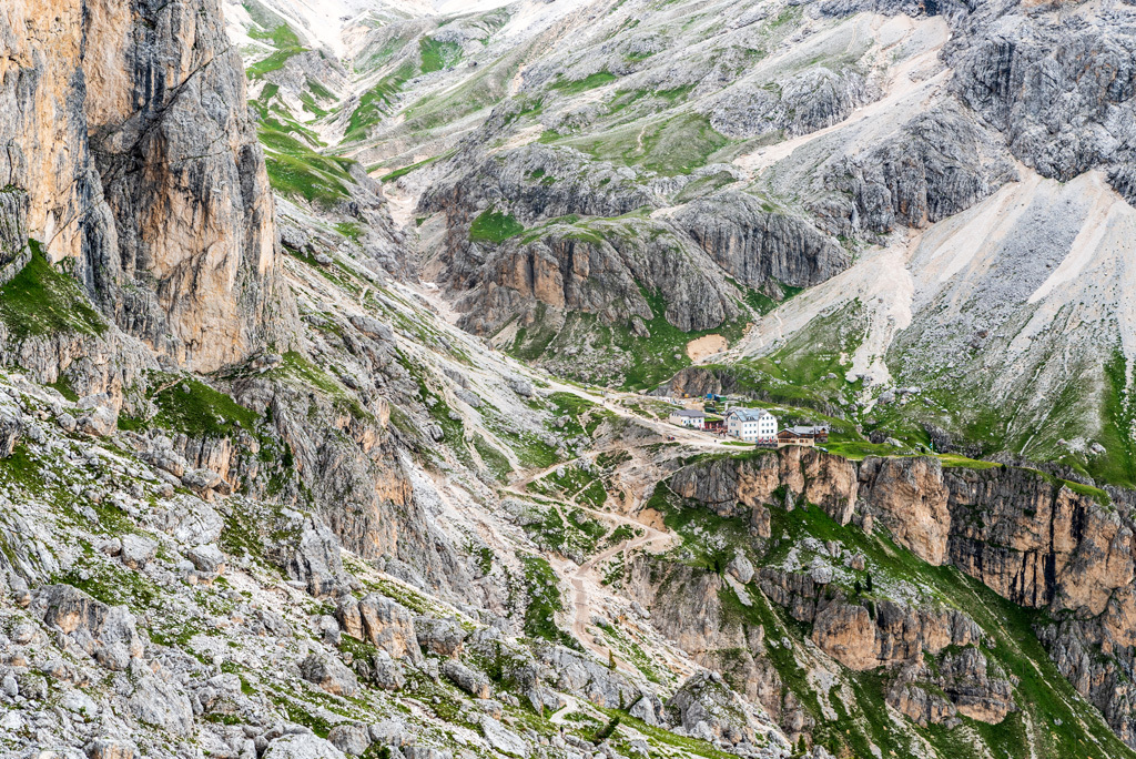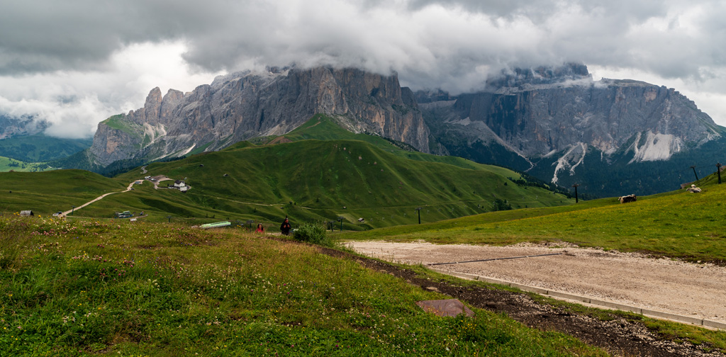 Během noci párkrát lehce zamžilo, ale nebylo to nic strašného. I ráno je obloha zatažená, tak se příliš dlouho nezdržuji a po rychlé snídani se vydávám na cestu. Ta pokračuje nejprve v podobném charakteru jako včera – tedy široká pěšina, která mě dovede až k chatě Plattkofel. Ta se nachází na jedné z nejpopulárnějších pěších jednoddeních tras Dolomit, což se v mém dalším dnešním pokračování projeví v podobě většího množství lidí jdoucích v protisměru, tedy od sedla Sella směrem k chatě Plattkofel. Za hezkého počasí jsou z této trasy krásné výhledy, já mám dnes bohužel počasí horší, ale naštěstí již neprší. Takže poměrně svižně procházím tento zalidněnější úsek až do oblasti sedla Sella, která je vstupní bránou do jedné z nejvyšších skupin Dolomit – masivu Sella.