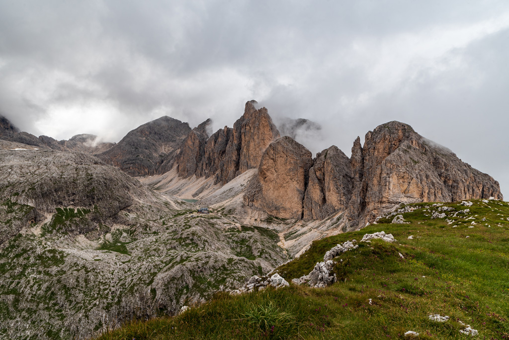Tohle krásné přírodní divadlo si užívám zcela sám a až poté se věnuji snídani a přípravě na druhý den mého putování. Bohužel se v mezičase zatahuje a vycházím již za převážně oblačného počasí. Mým prvním cílem je nejvyšší turisticky přístupný vrchol celé skupiny Latemar s nadmořskou výškou lehce nad 2800 m. Zde jsem již bohužel zcela v mracích a výhledy jsou omezené jen na občasné protrhání se oblohy a výhledy na horské sedlo hluboko pode mnou, které je mým dalším větším cílem dnešního dne. Vzdušnou čárou je to jen pár set metrů, ovšem mě čeká mnohem delší putování naokolo, které mi zabere několik hodin. První část tohoto úseku vede ve skalnatém lehce houpačkovém terénu, kdy traverzováním dalších vrcholků jen velice pozvolna ztrácím výšku a mnohdy jde spíše než o běžnou turistiku o lehké nezajištěné lezení – i zde je značení slabší, ale naštěstí zde není moc možností, kde špatně odbočit. Tento technicky náročnější úsek končí v sedle Kleine Latemarscharte v nadmořské výšce lehce nad 2500 m, kde jsem se dostal i pod mraky a mám aspoň nějaké ty výhledy.