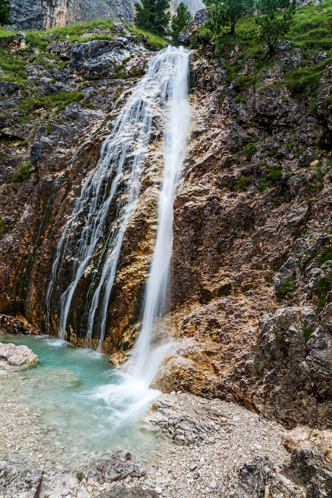 Nejprve nedocházím na samotné sedlo, ale k velkému parkovišti kousek od něj. Na samotné sedlo mohu dojít buďto po silnici nebo po loukách vedoucí kousek nad touto frekventovanou silnicí – volím pochopitelně druhou možnost. Za samotným sedlem Sella se mi nedaří najít pokračování značené trasy a jdu tedy kus dále po silnici, která serpentinami strmě klesá. Tuto silnici opouštím u odbočky značené trasy vedoucí do údolí Val Lastiés. K jeho dosažení musím ještě od cesty překonat menší vyvýšeninu a následně krátce klesnout do samotného údolí – až poté opravdu začíná strmý výstup do nitra skupiny Sella. Zpestřením tohoto stoupání je hezký menší vodopád nacházející se jen pár metrů pod pěšinou.