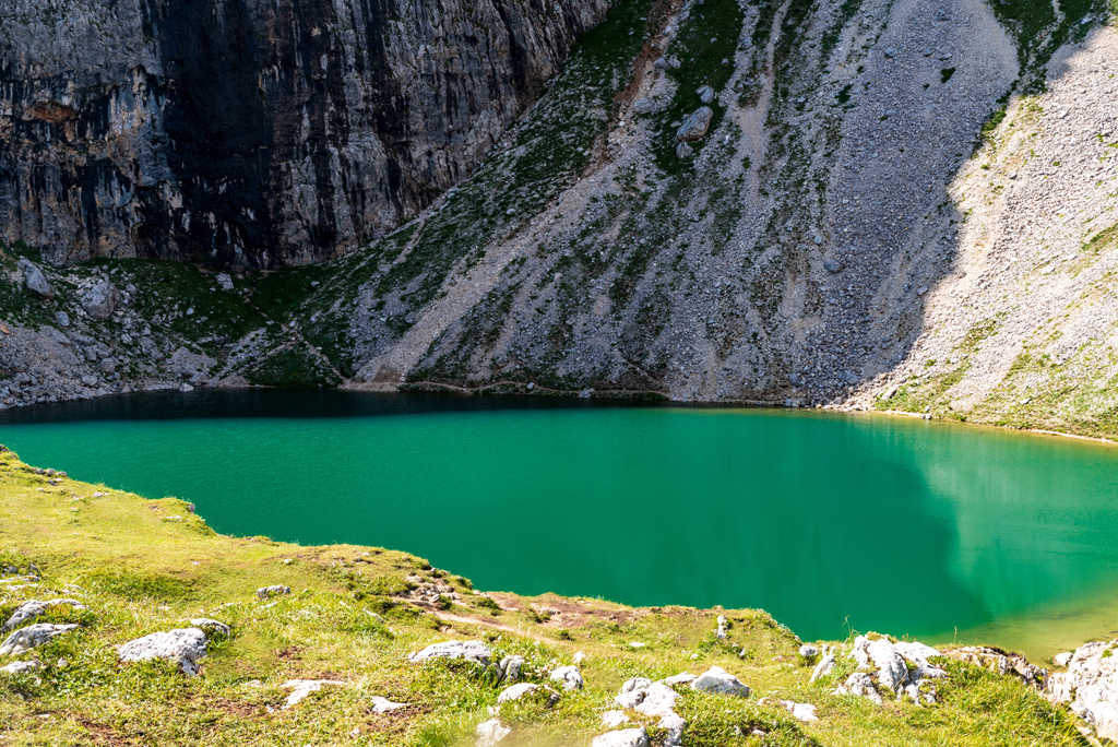 Za chatou Franz Kostner pokračuji v sestupu ještě po úzké pěšině, jen se začíná kolem mě objevovat tráva. Tento krajinářsky hezký úsek si vychutnávám a pomalejším tempem s častým kocháním se a focením docházím až k hezkému malému jezeru Lech Boe.
