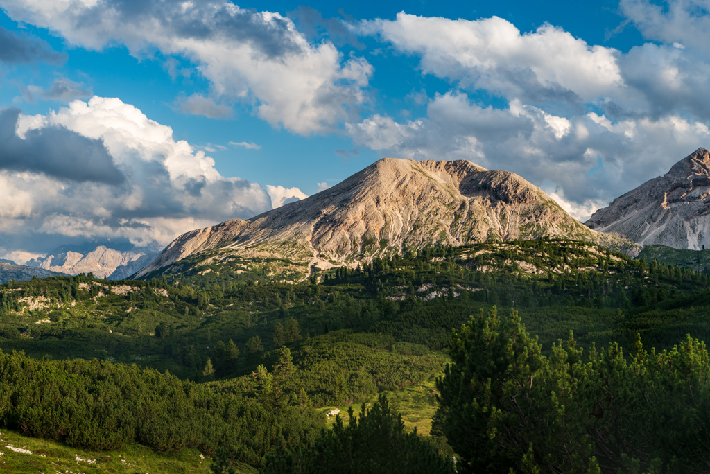 Ze sedla mě čeká o něco strmější sestup nejprve k chatě Fanes – zde je opět hodně lidí. Projdu se ještě skoro po rovině k další chatě Lavarella, po krátkém klesání za ní mě čeká ještě jedno mírnější táhlé stoupání a za ním hodně strmý a nekonečný sestup k chatě Pederu. Zde je ještě více přelidněno než u chaty Fanes, nebo se až k chatě dá dojet autem. Dlouho se zde nezdržuji a mizím vstříc horské skupině Senees – tedy po nějaké době opět do kopce. V těchto nižších polohách je vedro a úvod výstupu vede po široké zásobovací cestě otevřeným terénem. Naštěstí jiř brzy odbočuji spolu s variantou značené trasy do lesa – sice je tato varianta asi o něco strmější, ale kratší a hlavně vede ve stínu lesa. Odměnou za tento výživnější výstup mi je nakonec krásný výhled na nejvyšší vrchol skupiny Senes – Muntejela de Senes. Závěr dnešního dne mě pak dovede k chatě Sennes (správné jsou obě varianty Senes i Sennes).