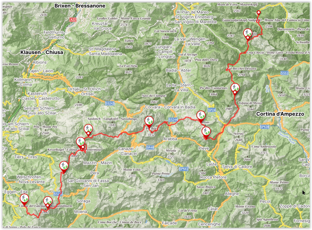 Dolomity jsou jedny z nejkrásnějších, ale i nejnavštěvovanějších hor Evropy. Skrze Dolomity vede i hned 10 oficiálních dálkových tras zvaných italsky Alta Via, německy pak Dolomiten Höhenweg. Nejznámější a nejnavštěvovanější z nich je bezesporu Alta Via 1. Tyto už předem vymyšlené a naplánované trasy jsou bezesporu nádherné, ovšem já si pro svůj přechod Dolomit vymyslel trasu vlastní v podobě 9denní (první den pouze odpoledne, poslední naopak jen dopoledne) trasy o celkové délce zhruba 130 km z Obereggenu na jihozápadním okraji Dolomit do Pragser Wildsee na severovýchodním okraji Dolomit skrze horské skupiny Latemar, Rosengarten, Seiser Alm, Sella, Fanes a Sennes.